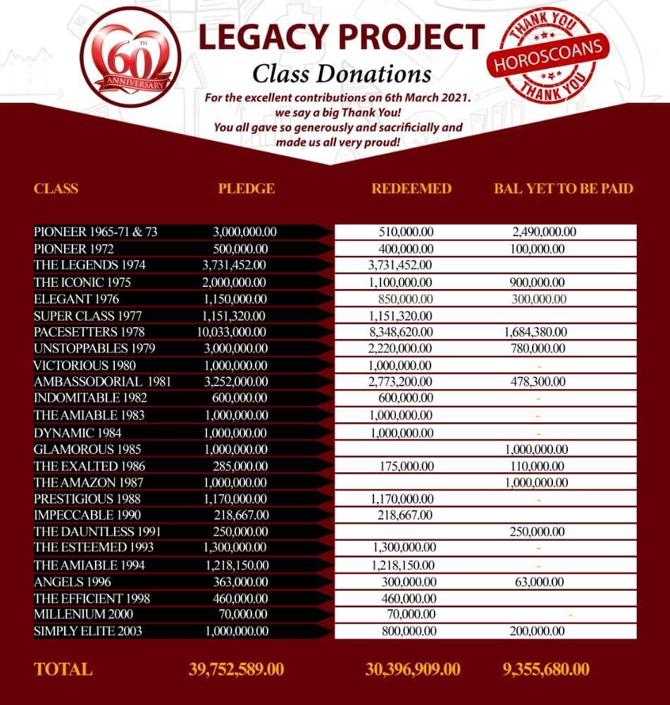 Our various classes are showing up in a big way to support our Legacy Project. Thank you so much everybody. Please don’t be left out. There is still time for other classes to join in leaving a lasting legacy for our School.
